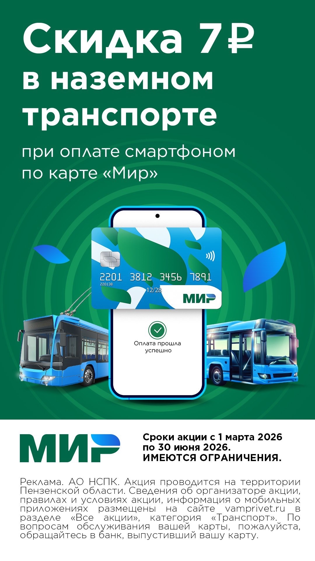 Подробные условия акции можно найти на сайте https://vamprivet.ru/promo/transport/oplata-poezdok-smartfonom-s-vygodoy-po-karte-mir-v-penzenskoy-oblasti-1/.